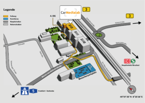 Die Einfahrt zum Besucherparkplatz des TRIWO Technoparks befindet sich auf der rechten Seite vor der Bahnunterführung (Navigationsadresse: Werner-von-Siemens-Straße 8, 76646 Bruchsal). Sollte die Schranke geschlossen sein, betätige die Klingel. Die Räume von CarMedialab befinden sich auf der anderen Straßenseite in Gebäude 5112 im 4. Stock. Der Eingang ist barrierefrei.