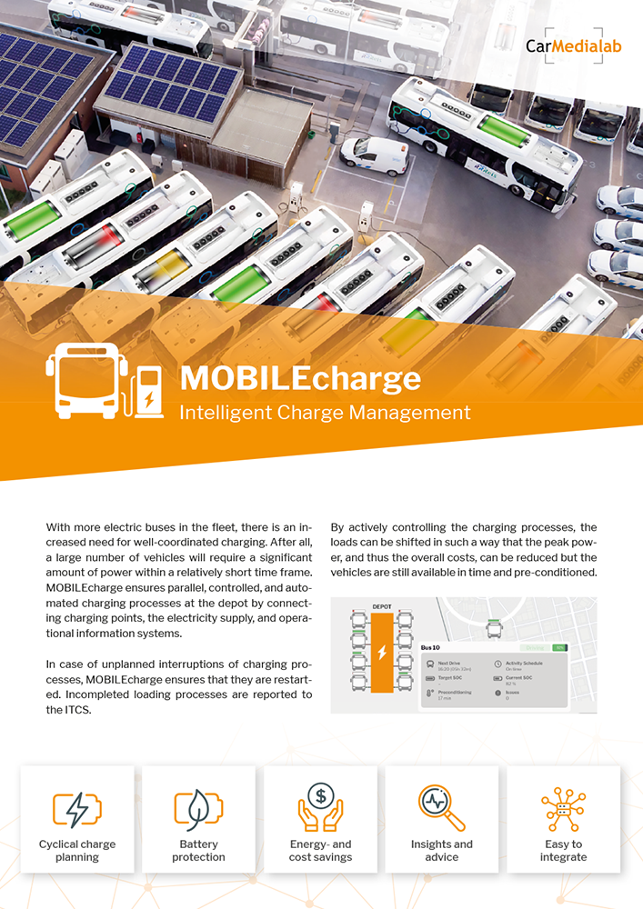 We coordinate your growing electric bus fleet and make ideal use of charging windows in the depot and on the route through charging management. Our management system ensures parallel, controlled and automated charging processes. It links charging points, energy supply and operational information systems. The result is a balanced load management system that incorporates your operational requirements, lower peak power and the use of cost-effective energy tariffs.
