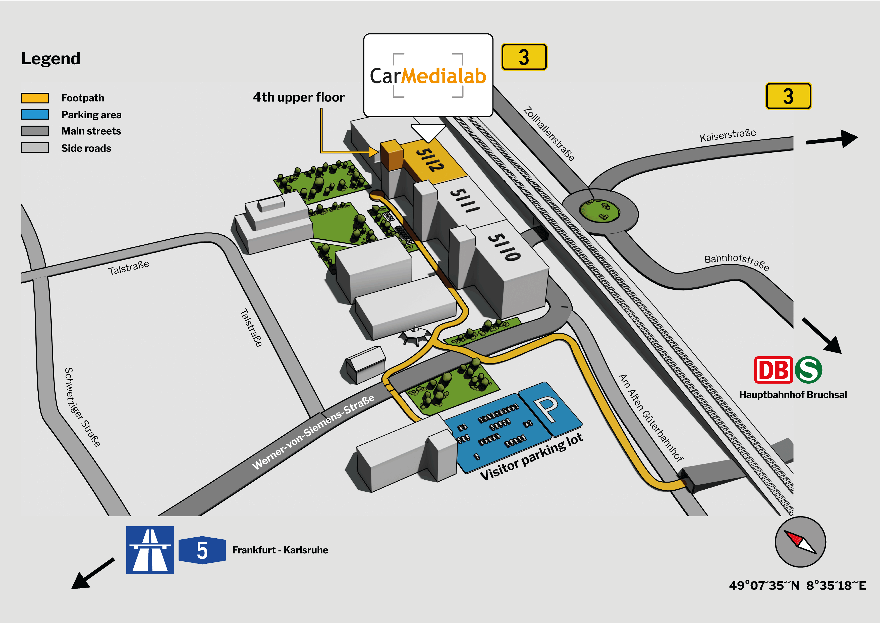 L’entrée du parking visiteurs du TRIWO Technopark se trouve sur le côté droit, devant le passage souterrain (adresse de navigation : Werner-von-Siemens-Straße 8, 76646 Bruchsal). Si la barrière est fermée, appuyez sur la sonnette. Le bureau de CarMedialab se trouve de l’autre côté de la rue, au 4ème étage du bâtiment 5112. L’entrée est accessible aux personnes à mobilité réduite.